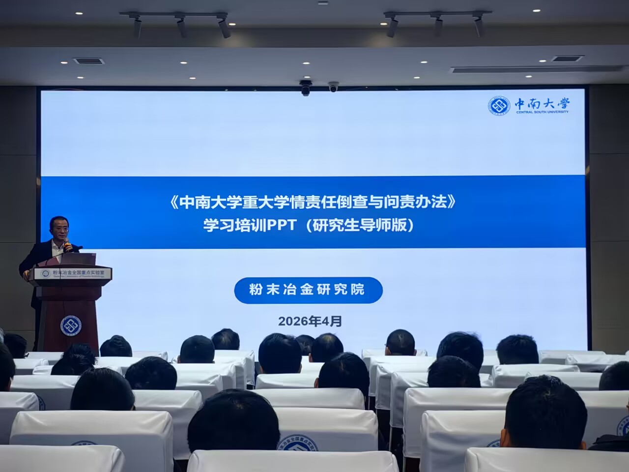 随后,黄曦副书记围绕《中南大学重大学情责任倒查与问责办法》开展专题讲解。他结合政策要求,细致拆解了重大学情责任倒查与问责的核心原则、实施流程,明确了研究生导师在学情管理中的具体职责与工作要求。黄曦副书记强调,导师要切实履行第一责任人职责,主动识别学情异常表征,深入排查问题成因,及时向亚洲体育博彩平台