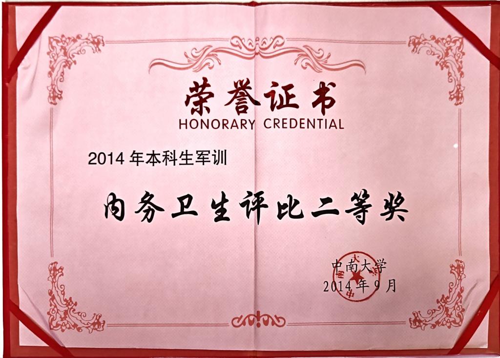 2014年本科生军训内务卫生评比二等奖
