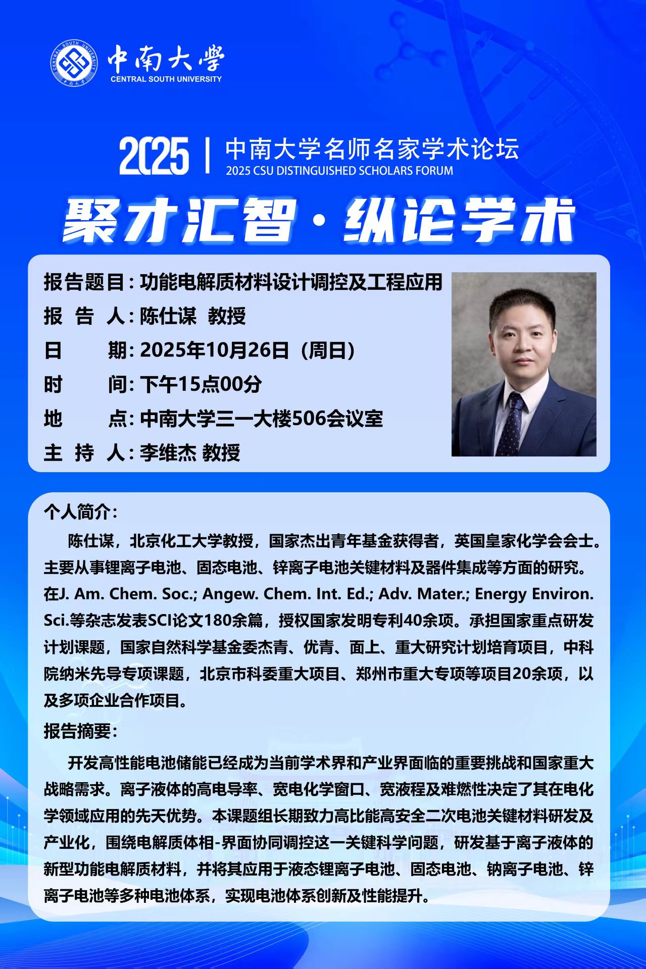 中南大学名师名家学术论坛(功能电解质材料设计调控及工程应用)