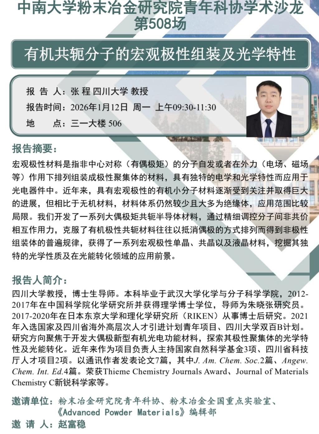 化学研究所并获得理学博士学位,导师为朱晓张研究员。2017-2020年在日本东京大学和理化学研究所(RIKEN)从事博士后研究。2021年入选国家及四川省海外高层次人才引进计划青年项目、四川大学双百B计划。研究方向聚焦于开发大偶极新型有机光电功能材料,探索其极性聚集体的光学特性及光能转化。近年来作为项目负责人主持国家自然科学基金3项、四川省科技厅人才项目2项。以通讯作者发表论文7篇,其中J.Am.Chem.Soc.2篇、AngewChem,Int,Ed.4篇。荣获Thieme Chemistry Journals Award、Journal of MaterialsChemistry C新锐科学家等。