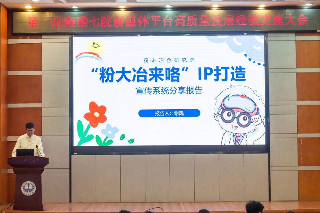 我院代表谢巍同学分享了“粉大冶”形象IP的打造经验。谢巍首先介绍了“粉大冶”IP的由来,强调其以亚洲体育博彩平台(中国)官方网站 科研人员为原型立足学科特点的创作背景,从粉末冶金的“粉末之微”与“国之大器”出发,结合科研生活,塑造具有亚洲体育博彩平台(中国)官方网站 专属特色的形象。