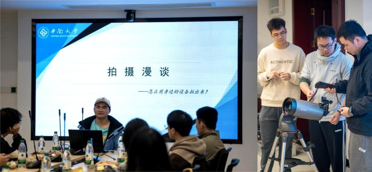 随后,为帮助同学们迅速掌握通过手机捕捉星空之美的关键技巧,段静怡、喻健凯两位同学细致入微地讲解了手机拍摄星空所需参数的调整方法以及如何稳固设备以确保拍摄效果,引导大家初探深空摄影的奥秘。与会同学们纷纷亲自上阵,体验天文望远镜的调试与观测,直观感受天文的魅力。