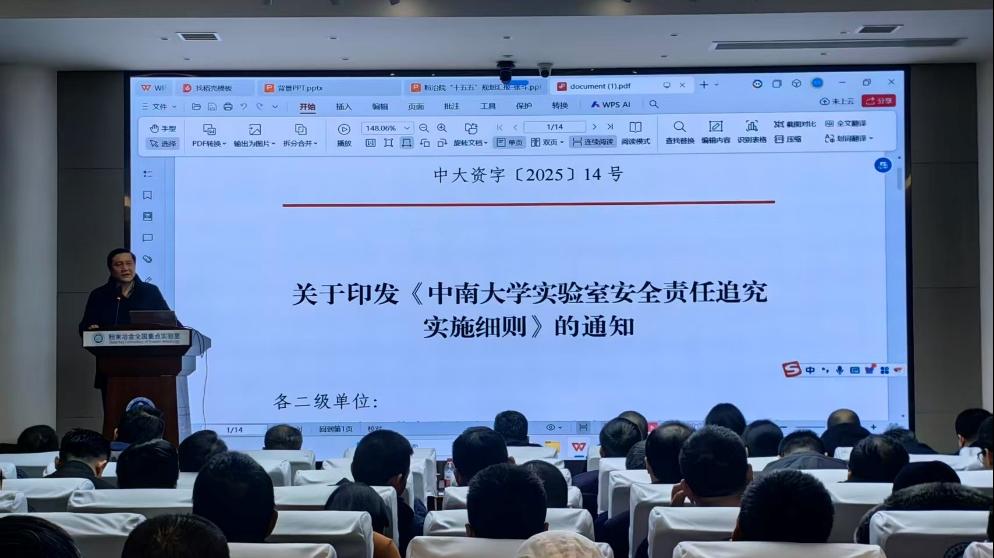 王德志书记围绕实验室安全、保密管理、师德师风建设等工作进行专题部署,并带领全体教职工重点学习了《中南大学实验室安全责任追究实施细则》等文件。王德志书记强调,安全是研究院发展的底线,全体师生要筑牢安全意识,严格落实实验室安全管理规范,严守保密纪律;同时要以师德师风建设为抓手,强化育人责任,营造风清气正的育人环境。