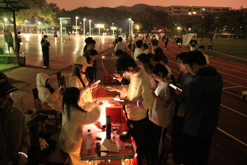 活动现场,同学们依次领取荧光手环,并在工作人员的协助下完成签到打卡。