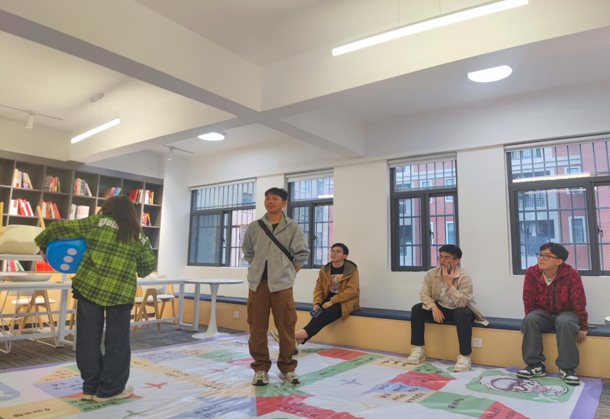 为进一步激发同学们对文学的喜爱,此次活动还在教室的地面上铺设了特制的“书香棋盘”。同学们兴致勃勃地走上铺设在地面的飞行棋盘。每个格子里都藏着一道文学类题目,涵盖诗歌、小说、名著等多个领域。在飞行棋互动环节,同学们笑声不断。每一次扔骰子,都伴随着期待与惊喜。有的同学回答问题得心应手,一路领先;有的同学运气不佳,但大家都在欢乐中前进,在游戏中分享“悦”读的感悟。