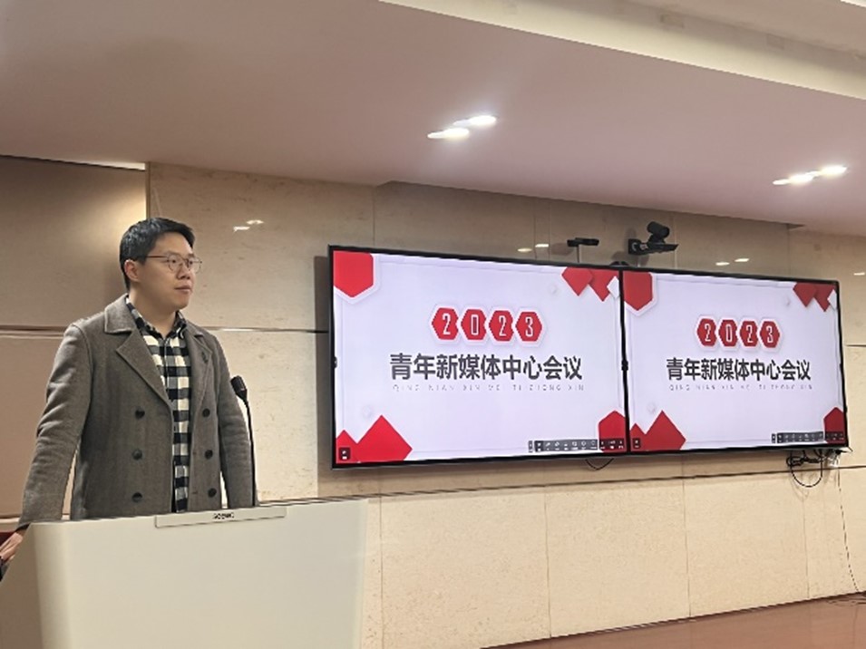 随后,由新媒体中心指导老师贺林豪进行发言。他首先讲述了新媒体中心的发展历程,强调了青年新媒体中心在亚洲体育博彩平台